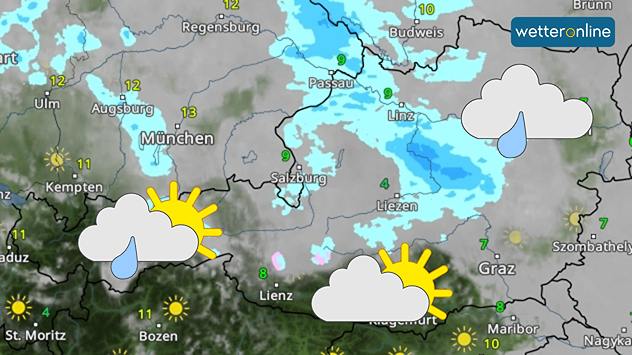 Der Feiertag beginnt meist trüb und entlang der Nordalpen bis ins Burgenland fällt Regen. Nur im Hochgebirge, oberhalb von etwa 2500 Metern, schneit es.