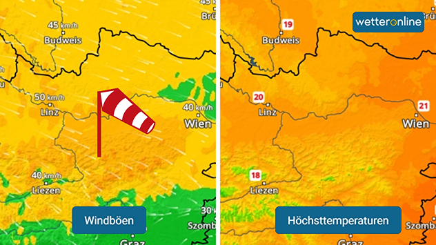 Österreich liegt zwischen einem Hochdruckgebiet im Westen und einem Tiefdruckgebiet im Osten. Weil sich die Luft um das Hoch im Uhrzeigersinn und um das Tief gegen den Uhrzeigersinn bewegt, weht dazwischen ein kühler Nordwestwind.