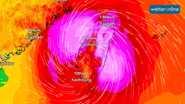 Taifun KONG-REY befindet sich über Taiwan. Im Inneren des Wirbelsturms werden Orkanböen um Tempo 200 erreicht, im WindRadar ist dies an den hellen Rosafarben zu sehen.