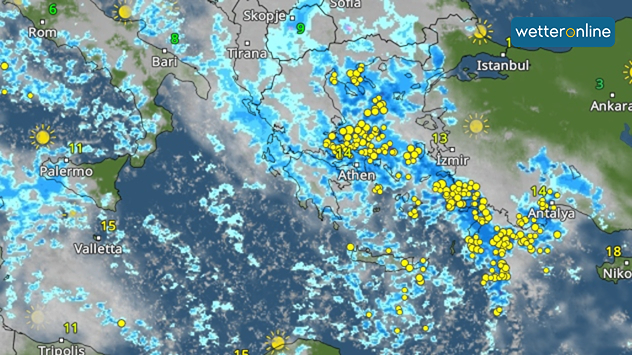 WetterRadar: In Griechenland und zunehmend auch in der Westtürkei gehen kräftige Regen- und Gewittergüsse nieder.